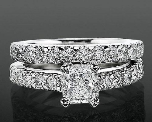 This stunning set features a 1.00 ct Radiant cut center diamond, SI2 Clarity, G/H Color that stands out and shines in its exquisite setting. This ring has a 14kt white gold setting with top quality G/H-SI round cut side diamonds that extend along the band on both sides.
