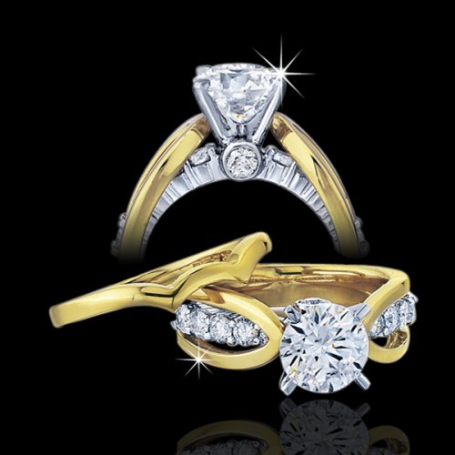 This intriguing two tone diamond engagement ring has a fascinating one-of-a-kind design that will leave you in total awe. A glittering 1.0 carat round brilliant cut diamond is the center focal point of this amazing piece. This diamond levitates above the ring allowing the maximum amount of light to penetrate and radiate from it. The side diamonds are absolutely stunning equaling .70 ctw The uniquely inspired setting is made of high polished 14kt. white and yellow gold