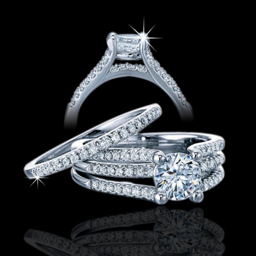 This amazing bridal set features a revolutionary design that will capture everyone's attention. A sparkling round brilliant cut 1.0 carat diamond is the central focal point. This diamond has a clarity of SI2 and a color grade of G. The centerpiece is held in place by delicate prongs and a structure underneath that is also embellished with pave diamonds. The way this diamond is set, it allows it to shine unobtrusively for a spectacular look. The prongs and underneath the main diamond glitter with round cut diamonds that have a total combined weight of .50 carat, SI1 clarity, G color, set in 14kt white gold.