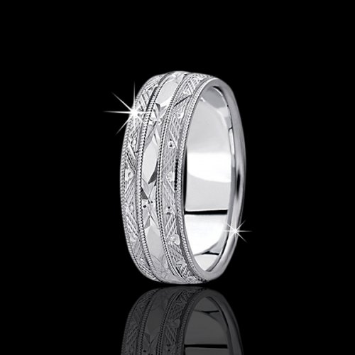 An elegant style, this 7mm wide Fancy Design wedding ring has a different motif at the center and at edges. The cuts at center motif are separated by high polished pieces, whereas edges have many tiny vertical cuts in addition to bigger diagonal ones. The band is high polished, with milgrain on each side of edges.