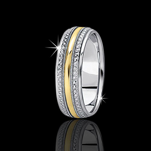Beautifully crafted in 14kt, this 7mm wide fancy design wedding band is high polished with detailed milgrain on each side. This band is available in solid white or yellow and two tone 14KT, 18KT, PLATINUM AND PALLADIUM.