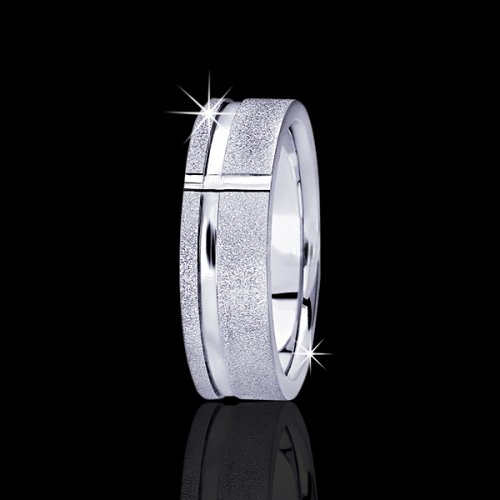 This fantastic wedding band has a flat design that is very distinguishable. A classic religious piece, this 7mm wide Carved Design wedding band has one bright cut parallel to edges all around, and another vertical cut to complete a cross design. The band is stone finished, with bright cuts.